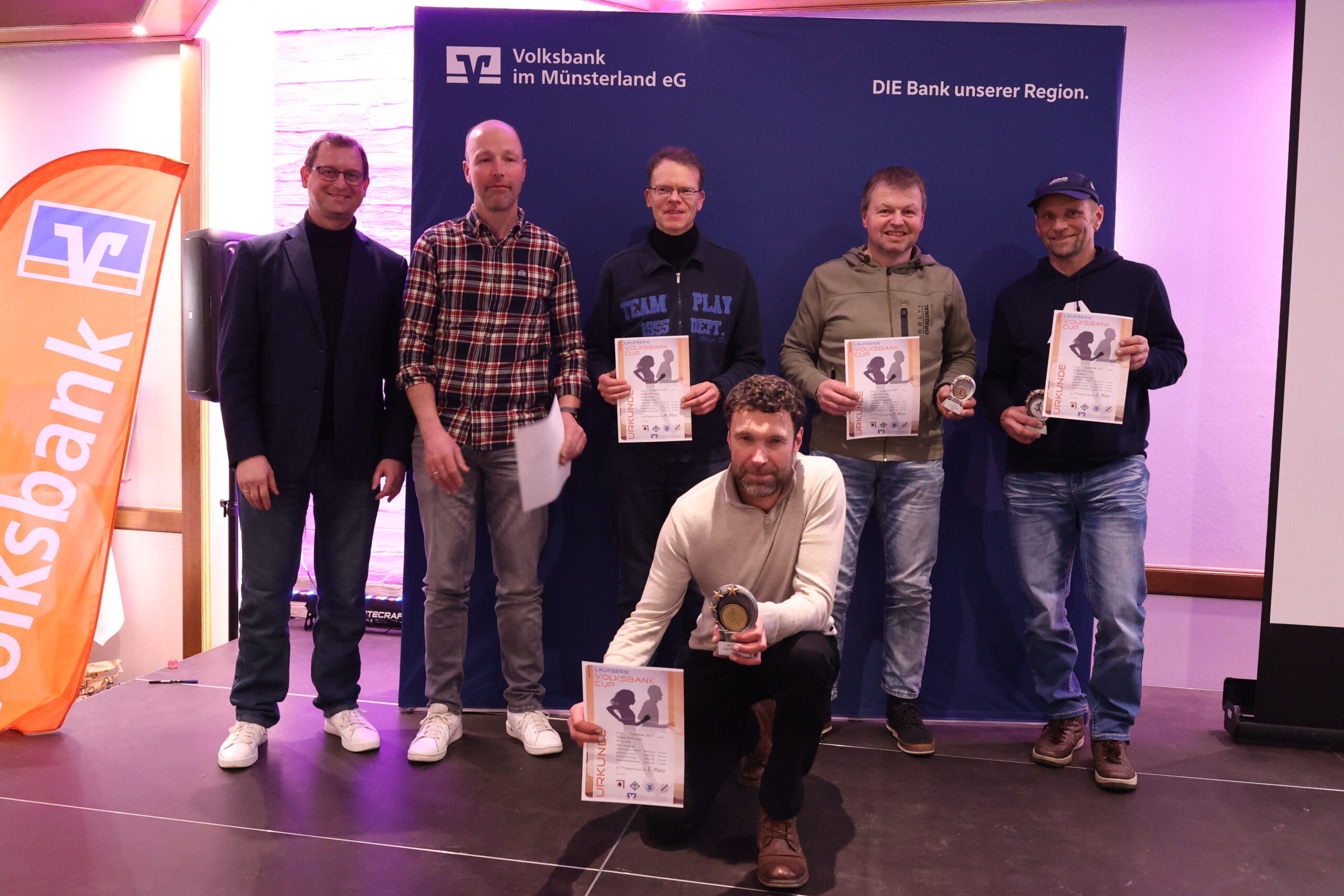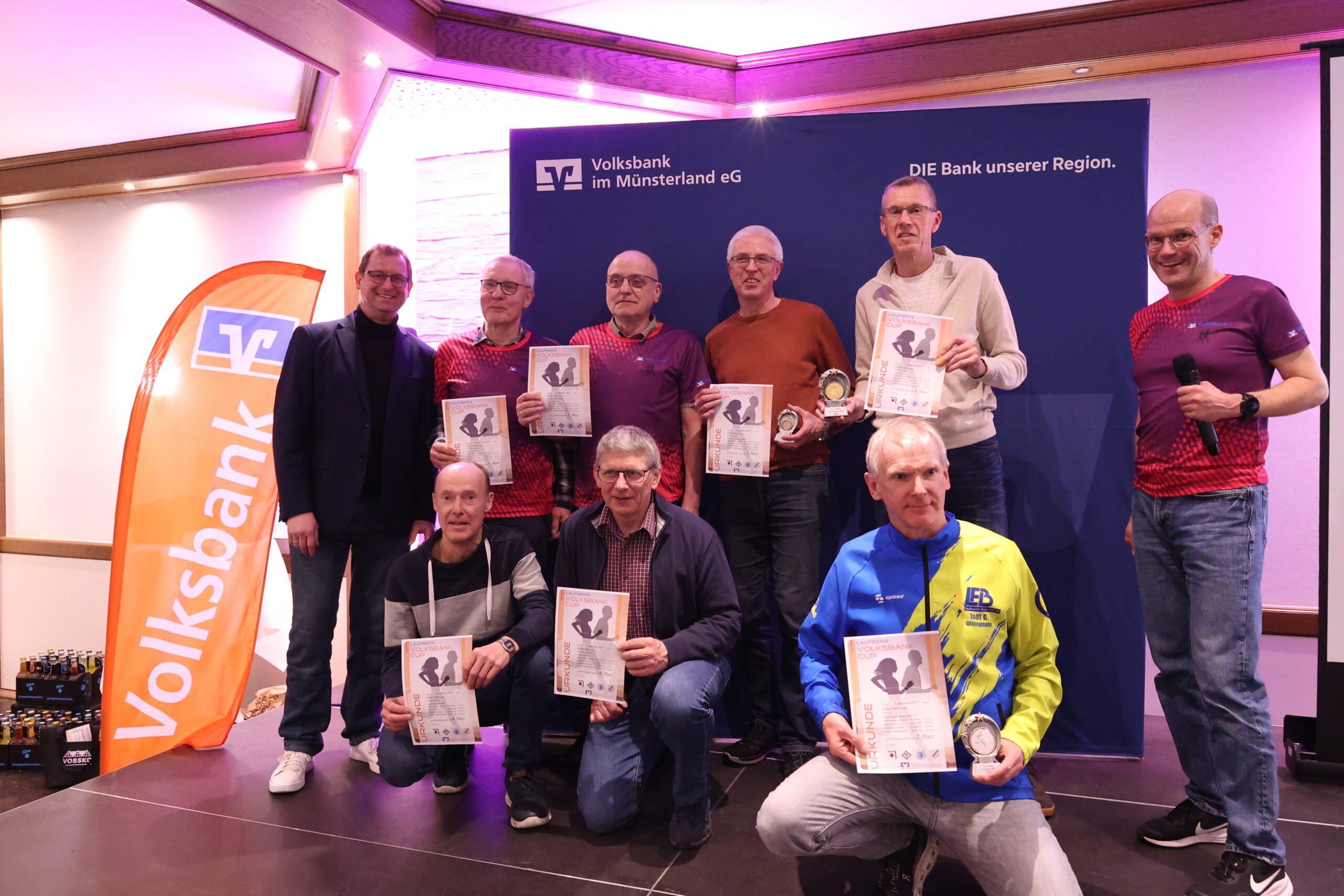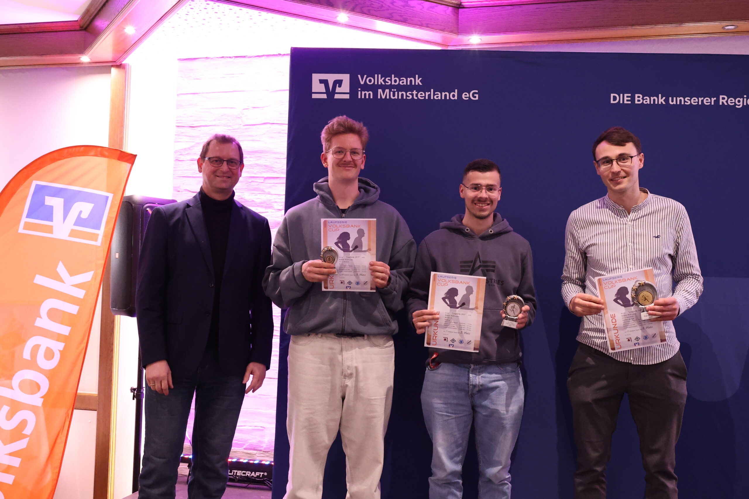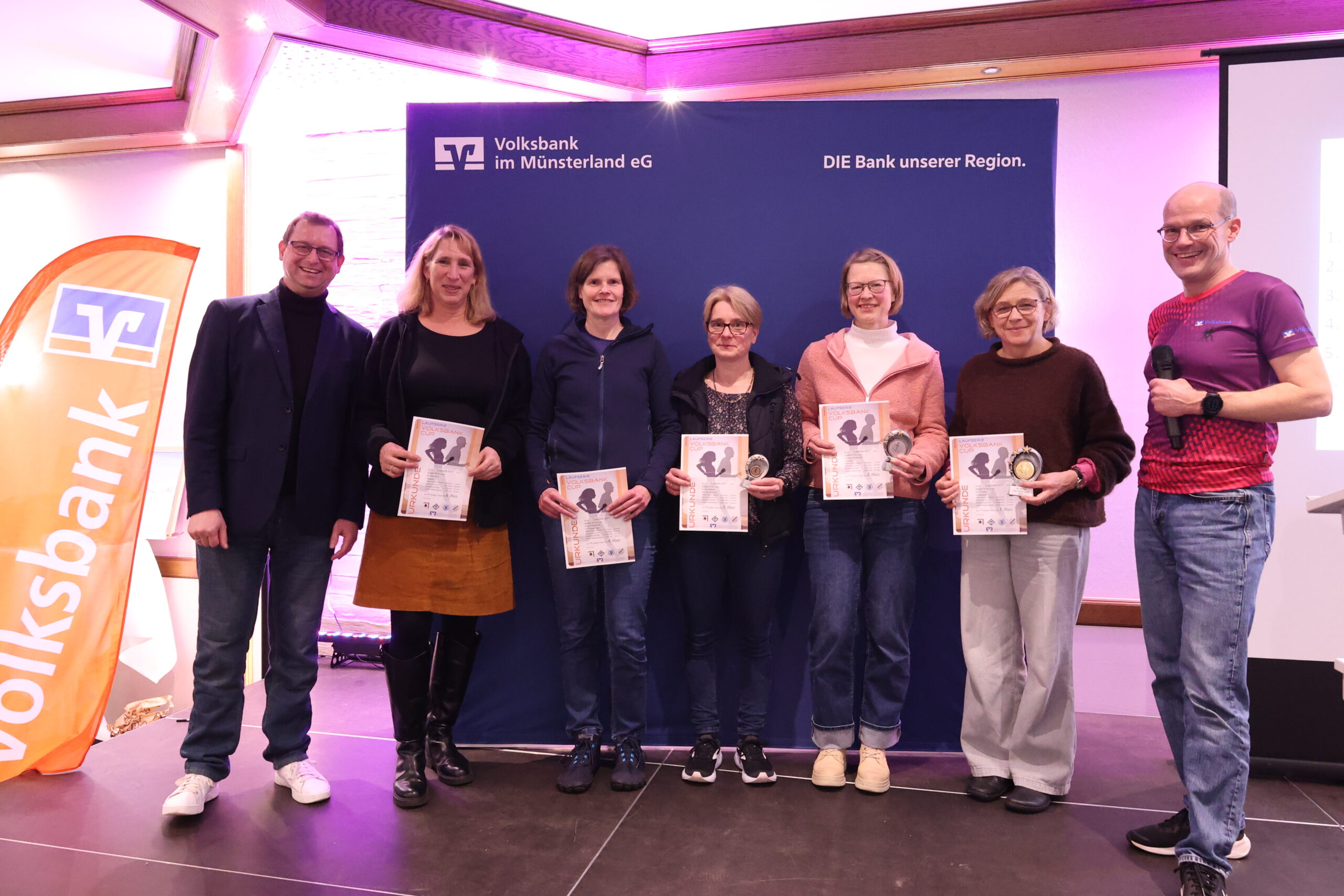 Lange hatten die Läuferinnen und Läufer gerätselt, wie es nach dem letzten Everswinkeler Nikolauf 2025 mit der Volksbank-Cup-Laufserie durch den Kreis Warendorf weitergeht. Während der Abschlussveranstaltung in der Gaststätte Mersbäumer in Ostbevern lüftete Moderator Mirco Borgmann aus dem Orga-Team das lang gehütete Geheimnis: Der Citylauf in Oelde (13. Juni) wird neuer Bestandteil der Laufserie werden. Der Volksbank-Emslauf in Einen, dessen Fortsetzung ebenso in den Sternen stand, bekommt mit dem 24. April einen neuen Termin und wird Auftaktlauf der Serie. Der Volksbank-Beverlauf Ostbevern (27. Juni) rutscht auf die dritte Stelle, der Volksbank-Citylauf Telgte (26. September) bildet den Schlusslauf der Serie.