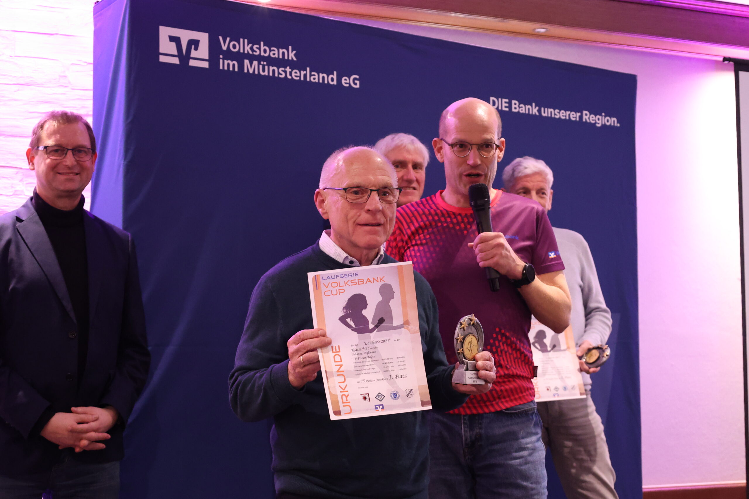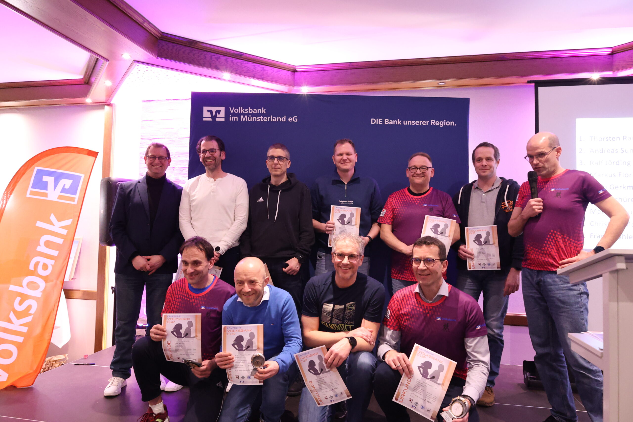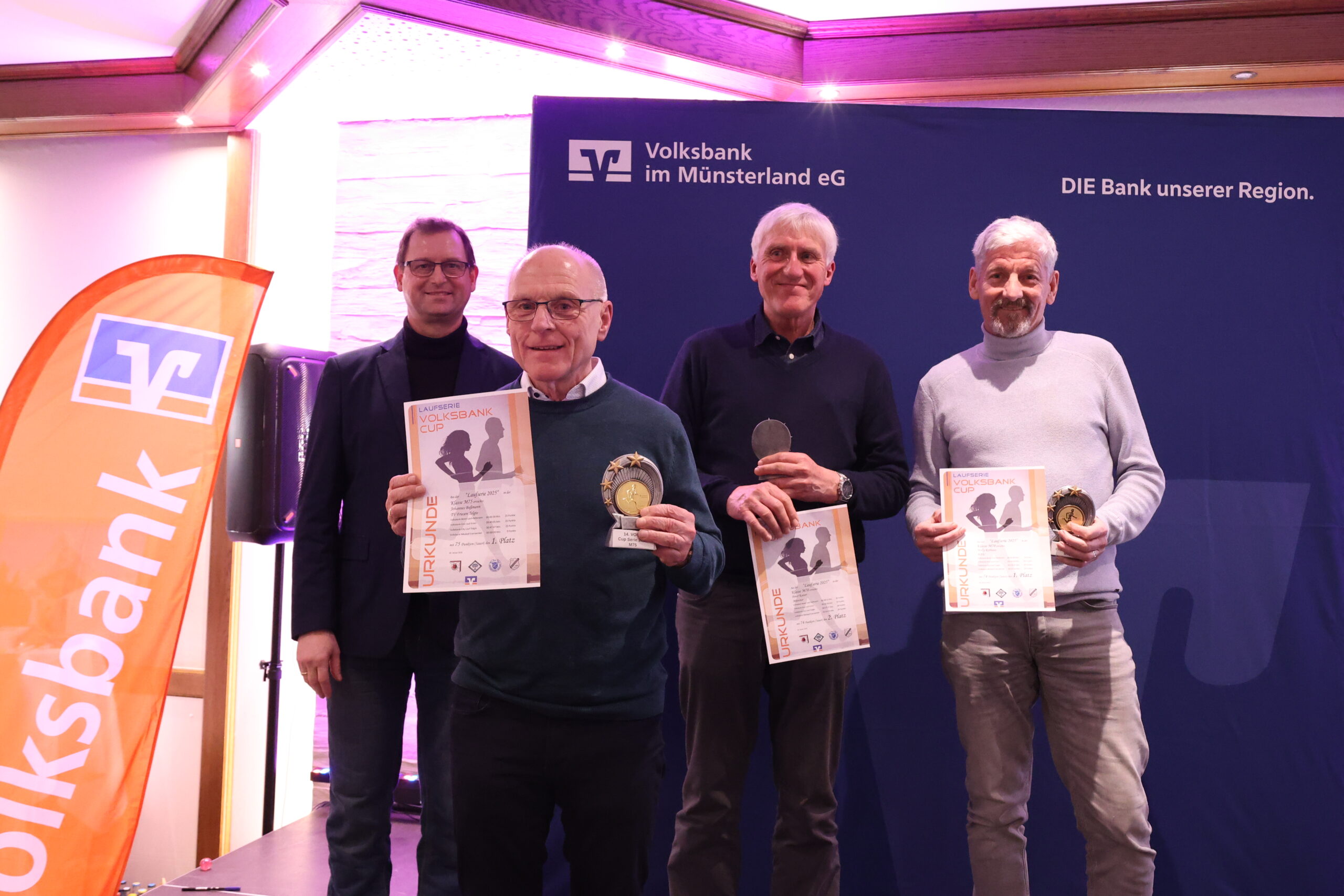 Lange hatten die Läuferinnen und Läufer gerätselt, wie es nach dem letzten Everswinkeler Nikolauf 2025 mit der Volksbank-Cup-Laufserie durch den Kreis Warendorf weitergeht. Während der Abschlussveranstaltung in der Gaststätte Mersbäumer in Ostbevern lüftete Moderator Mirco Borgmann aus dem Orga-Team das lang gehütete Geheimnis: Der Citylauf in Oelde (13. Juni) wird neuer Bestandteil der Laufserie werden. Der Volksbank-Emslauf in Einen, dessen Fortsetzung ebenso in den Sternen stand, bekommt mit dem 24. April einen neuen Termin und wird Auftaktlauf der Serie. Der Volksbank-Beverlauf Ostbevern (27. Juni) rutscht auf die dritte Stelle, der Volksbank-Citylauf Telgte (26. September) bildet den Schlusslauf der Serie.