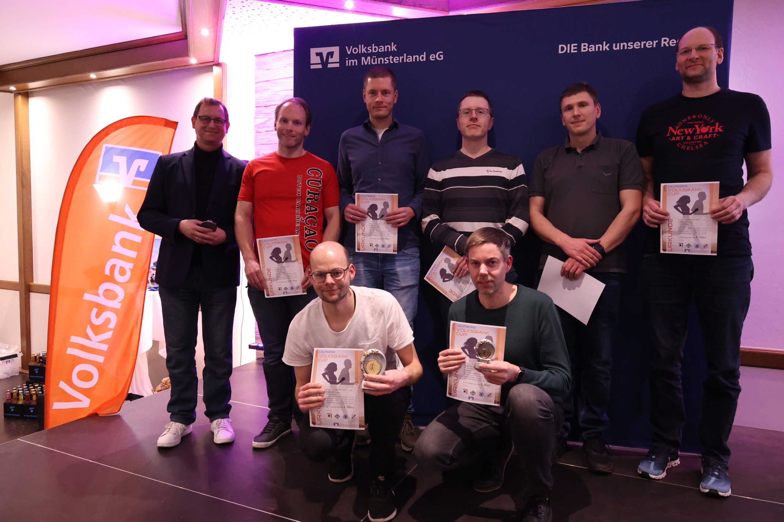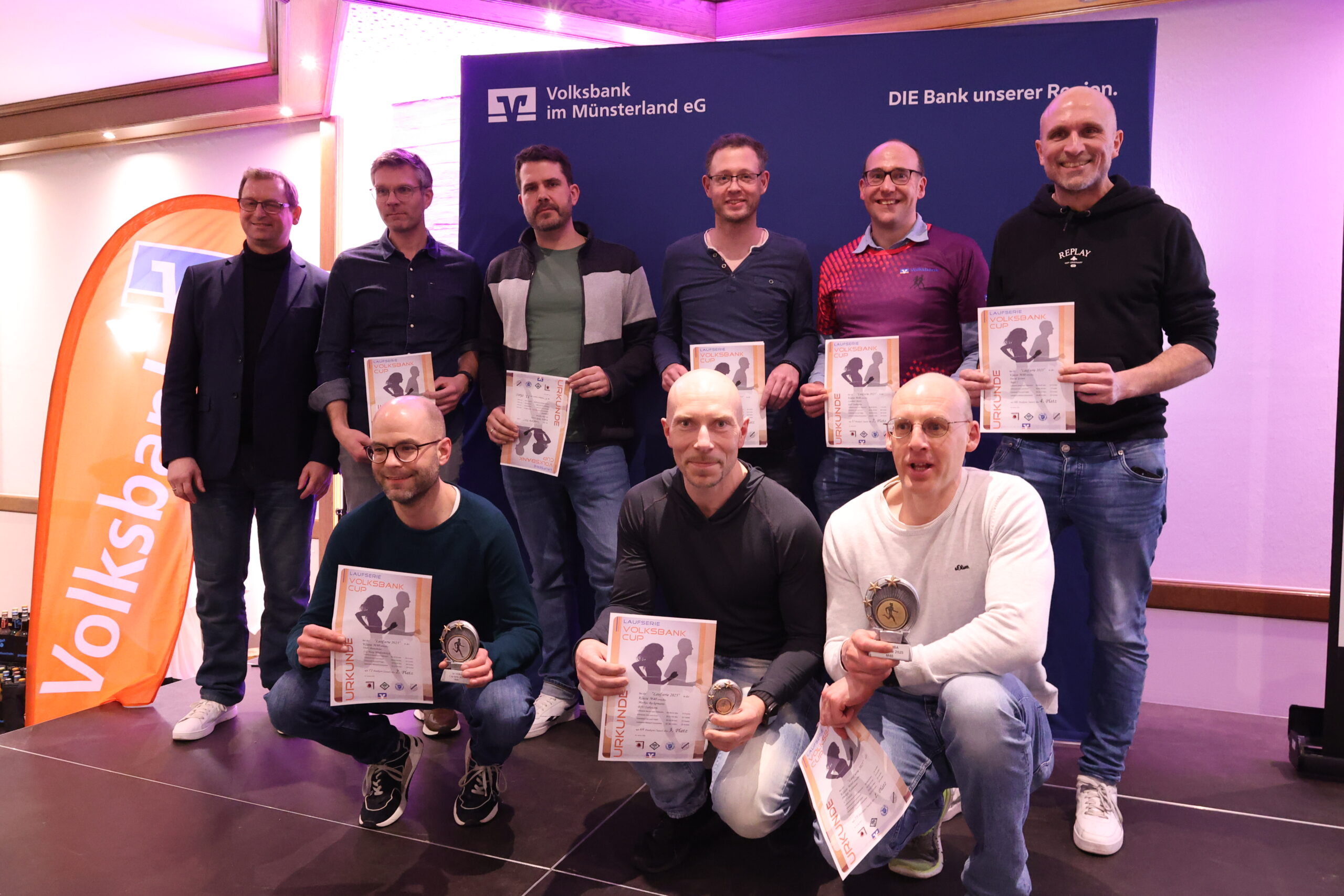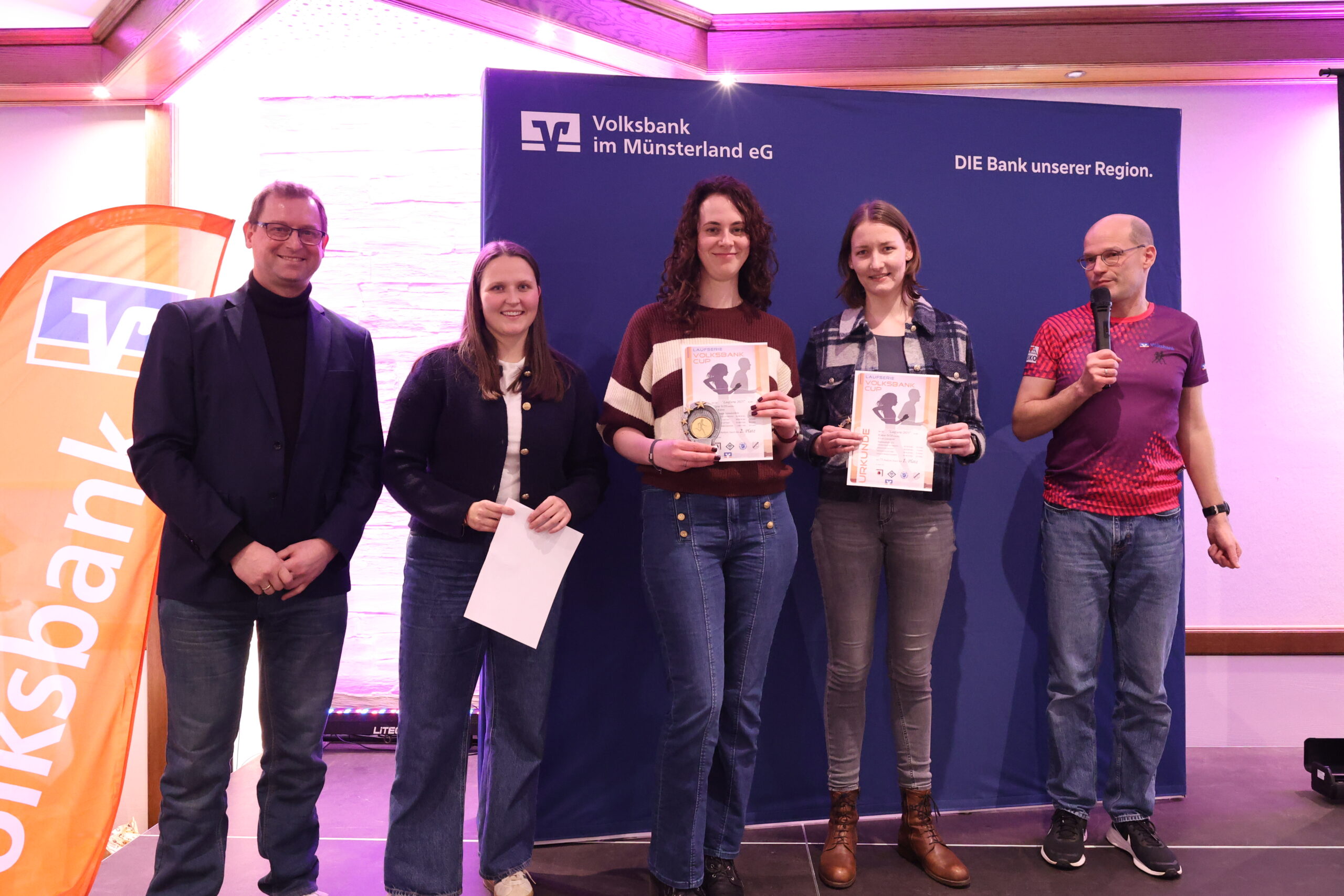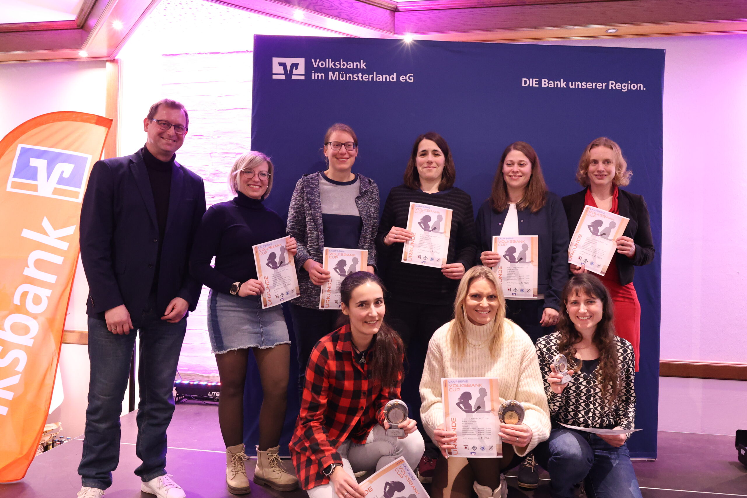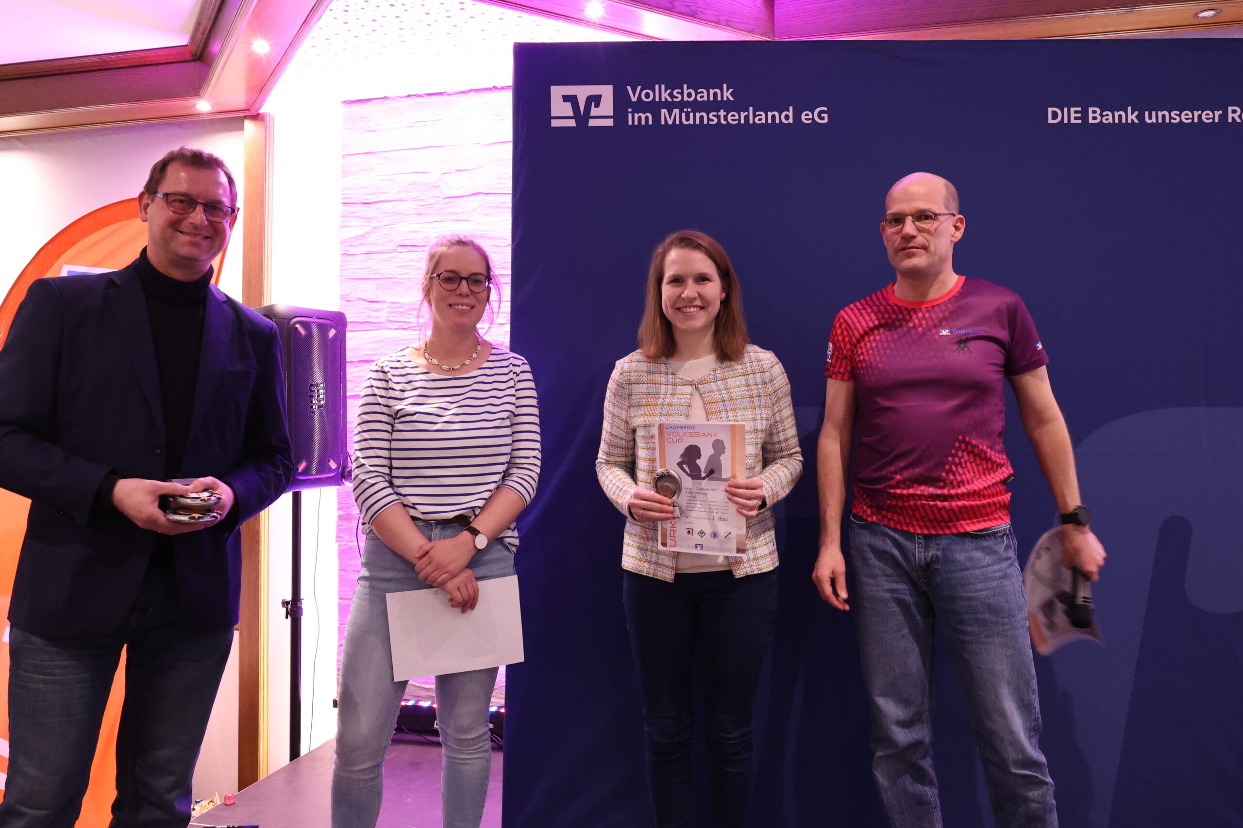 Andreas Terborg von der Volksbank im Münsterland nahm zusammen mit Moderator Mirco Borgmann die Siegerehrungen auf der Bühne vor. Gesamtsiegerin der Frauen wurde Helena Hamsen (Alverskirchen), gefolgt von Eva Wunderlich (WSU Warendorf) und Bettina Kalläne (LV Oelde). Bei den Männern hatte Jonas Barwinski (Fit2Run Beckum) zum vierten Mal in Folge die Nase vorn. Platz zwei geht an Philipp Kaldewei vom LV Oelde, Platz drei an Dirk Hansmeier (LG Burg Wiedenbrück). Ausgezeichnet wurden auch die jeweiligen Altersklassensiegerinnen und -sieger. Pokale gab es jeweils für die ersten drei Plätze, Urkunden für alle Teilnehmer der Serie.